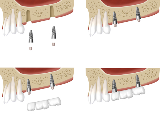 Gli impianti dentali osteointegrati, rigorosamente di qualità certificata, sono delle viti sterili che vengono inserite nell’osso e in questo modo svolgono il ruolo delle radici dei denti persi. I risultati, costantemente monitorati mediante visite dentistiche periodiche ai nostri pazienti, sono duraturi nel tempo e di elevata qualità funzionale ed estetica.